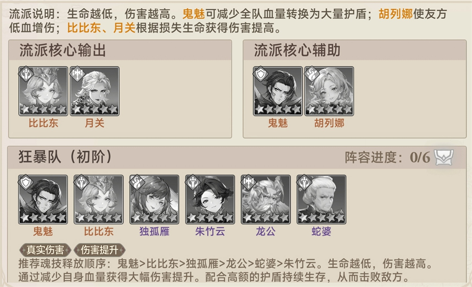 核心辅助:鬼魅(将全队当前生命转化为护盾)、胡列娜(友方低血量时提供增伤)