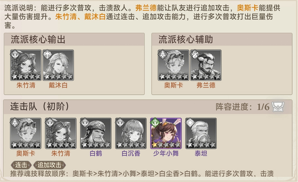 初阶阵容:奥斯卡、朱竹清、白鹤、白沉香、少年小舞、泰坦