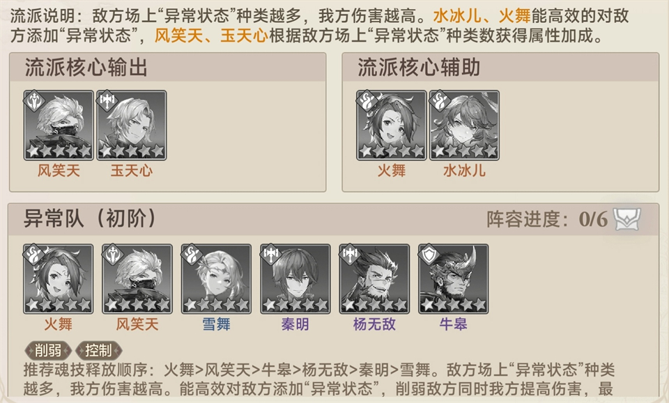 核心输出:风笑天、玉天心(伤害与属性随敌方异常状态数增强)