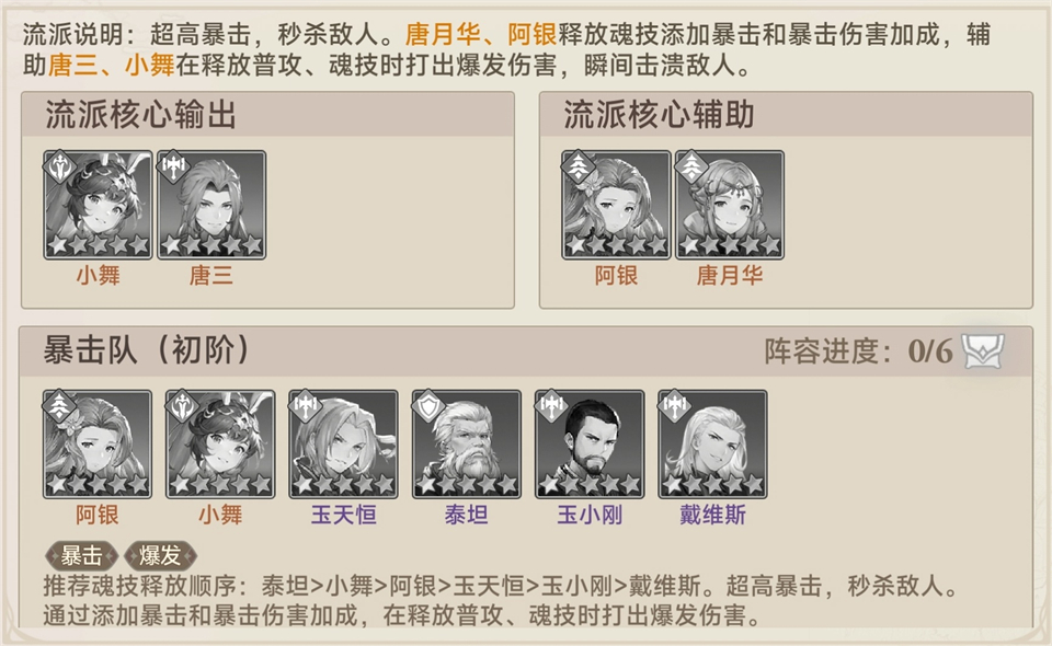 核心辅助:阿银、唐月华(提供暴击与暴伤加成)
