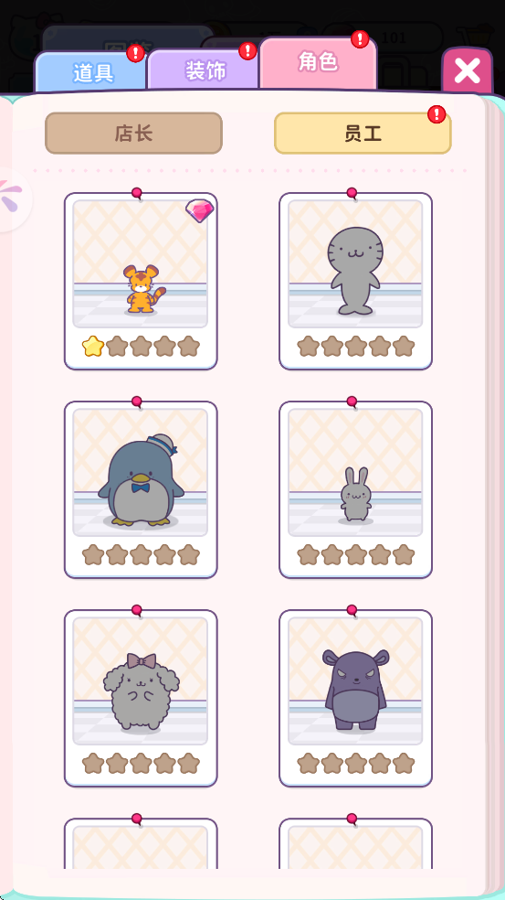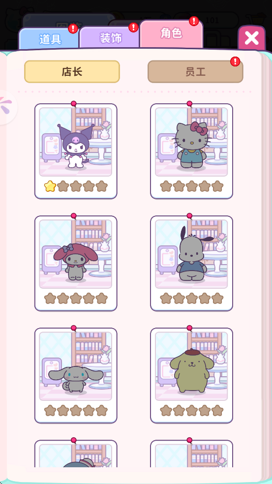 游戏中角色分为两类:店长角色与员工角色,均来自广受欢迎的三丽鸥家族。