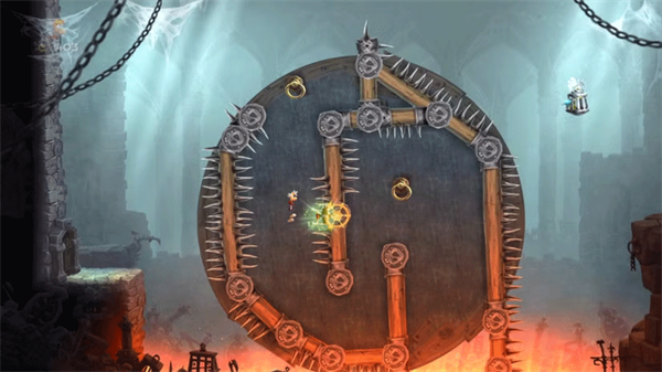 本关最复杂解谜点。遇到旋转轮桥时,选择上方路径进入秘密门。内部有带把手的轮盘与尖刺。先跳至第一把手顺时针旋转至安全落点,再墙跳至第二把手逆时针旋转,打通通往国王的路径,击破笼子即可。