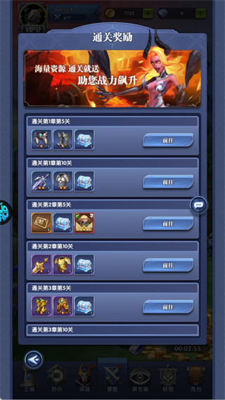 每完成指定章节均可获得装备、道具、英雄碎片等丰厚奖励,持续通关是提升战力的核心途径。