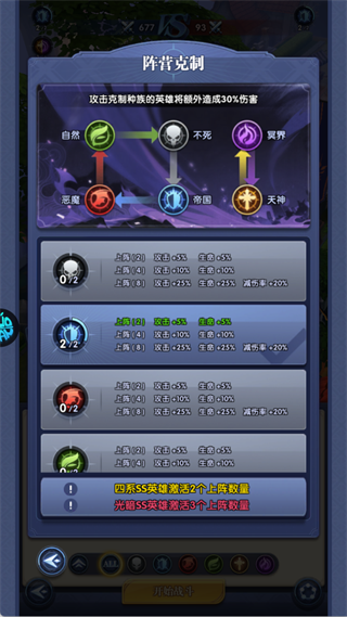阵营克制关系为:自然 → 不死 → 帝国 → 恶魔 → 自然,冥界与天神相互克制。同阵营英雄上阵可叠加攻击力、生命值等属性加成,合理利用克制关系可大幅提升战力。