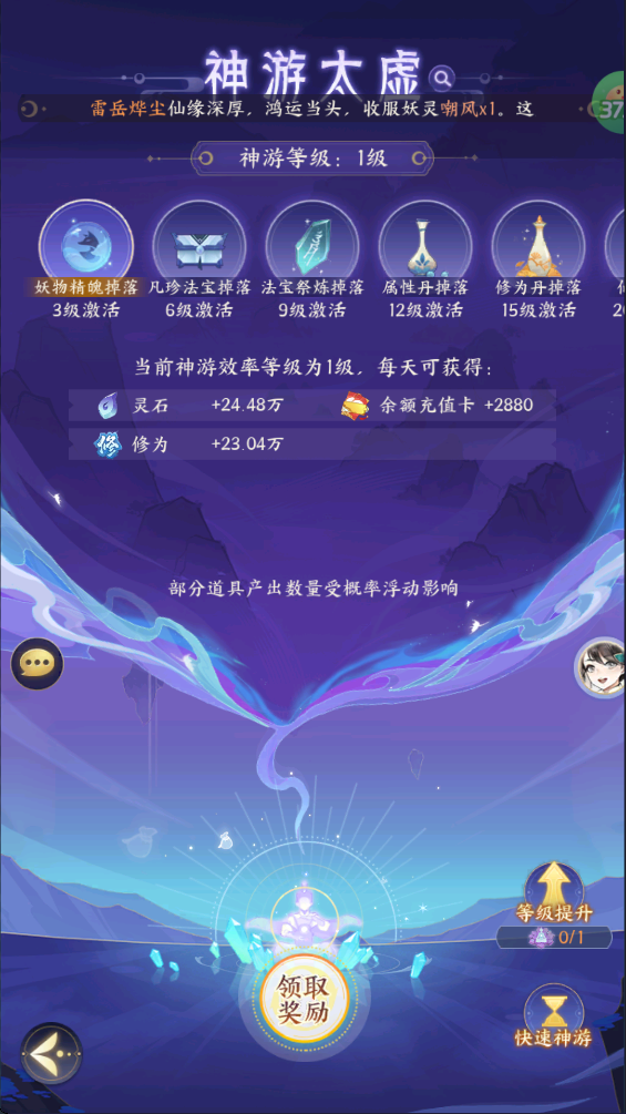 进入太虚神游秘境挑战,通关后可获得丰厚修为及其他稀有资源。
