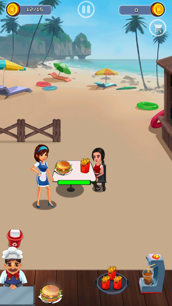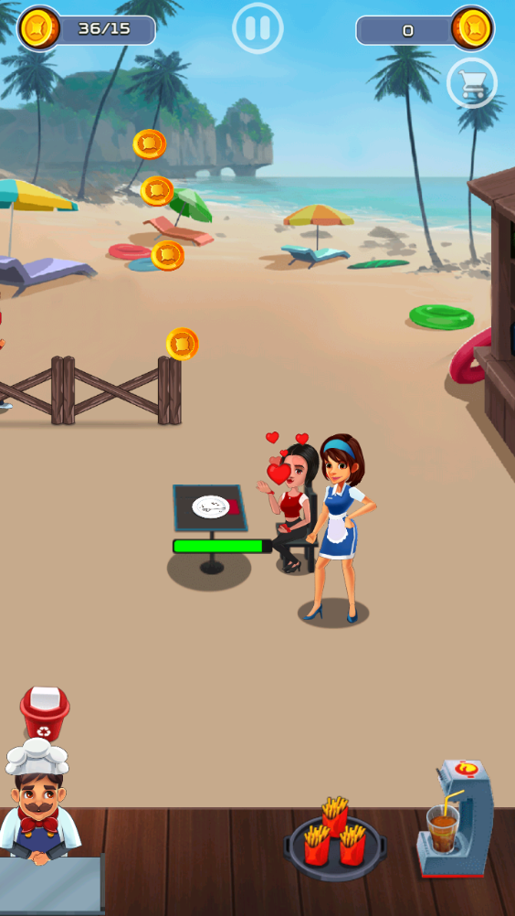 3. 制作完成后,由左下角的厨师将餐品端给顾客,待其用餐完毕即可获得相应金币奖励;