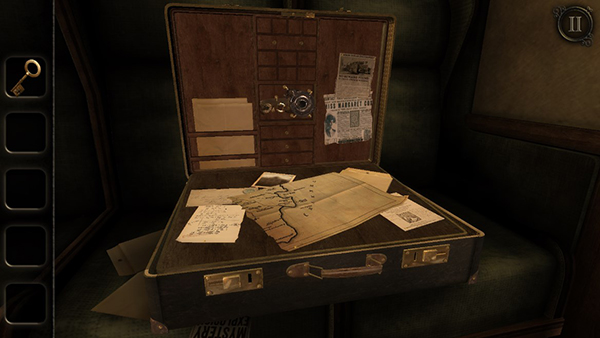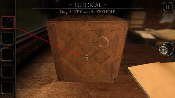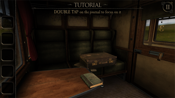 游戏开场位于一节行驶中的车厢内。首先点击桌上的日记本阅读内容;随后列车驶入隧道,桌面浮现一个木盒,双击靠近并拾取其中的钥匙。