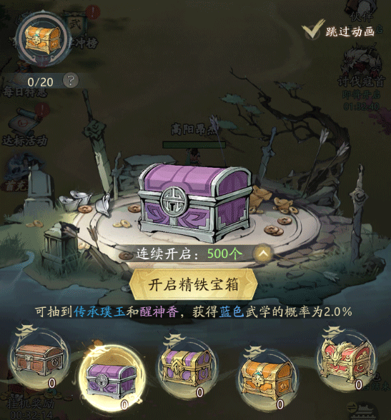 3. 宝箱按品质分为木质、精铁、黄铜、鎏金、珐琅五级。等级越高,获得高品质武学与稀有道具的概率越大。同时,开启宝箱可累积进度值,达成条件即可领取阶段性奖励。