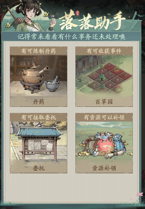 6. “落落助手”可一键接取任务、快速进入副本,并集中查看当前资源储备,是新手阶段提升效率、管理进度的重要工具。