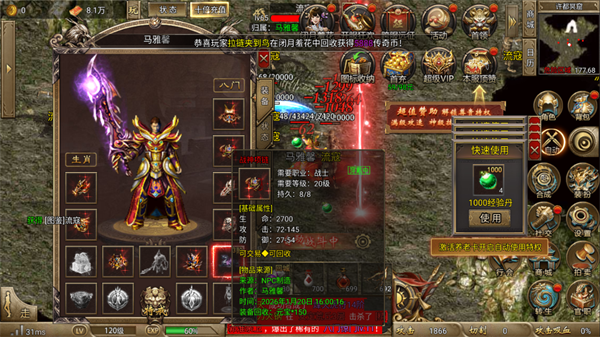 新手角色默认开启自动回收、全屏拾取与离线助手功能,挂机刷怪也能轻松爆装。多余装备可用于回收或合成更高阶武器,同时通过狩猎场、矿场等玩法稳定获取灵符与传奇币,让整体养成过程轻松又高效。