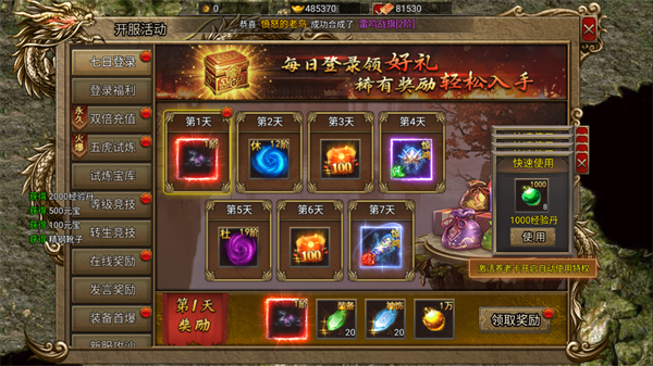 新手上线首要任务是完成每日登录,首日即可领取1阶攻击宝石等实用道具。同时积极参与“五虎试炼”和“等级竞技”等开服活动,快速积累元宝、经验丹等关键资源,助力角色迅速起飞。