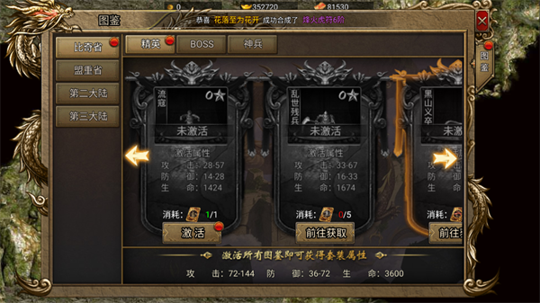 通过收集指定道具激活图鉴,可直接提升攻击、防御与生命属性;集齐整套更可解锁额外套装加成。建议前期优先激活“流寇”等低门槛图鉴,快速夯实基础战力,为后续挑战BOSS与PK对战做好准备。