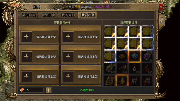 玩家可将多余装备或非绑定道具上架拍卖行寄售,仅收取10%交易税。新手可通过出售掉落物品换取灵符或元宝,再用于购买所需装备或养成材料,实现资源高效循环利用。