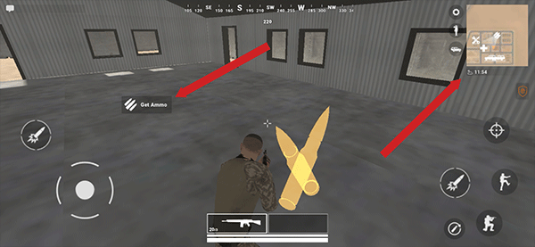 5. 初始出生点位于我方安全区域,玩家可在此进行多项关键操作:靠近弹药补给点并点击“Get Ammo”获取弹药、驾驶载具或恢复生命值。