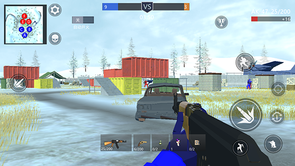 6. 操作采用虚拟摇杆+功能按键布局:左下角滑动轮盘控制角色移动,右下角按键分别实现射击、跳跃、下蹲等关键动作。