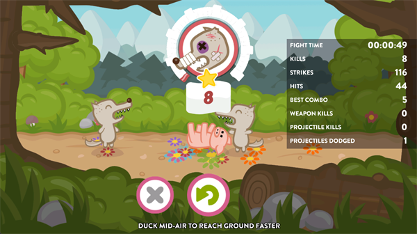 功夫小猪是一款充满刺激与趣味的2D格斗游戏,玩家操控小猪忍者在森林和街头竞技场中与成群愤怒狼群展开殊死搏斗。通过滑动和点击屏幕,可挥拳、踢腿或使用敌人掉落的武器攻击,同时躲避火箭、破坏球等投射物。