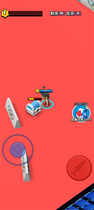 4. 进入对战地图后,玩家可主动拾取场景中的宝箱获取资源。右侧红色刀形按钮为普通攻击键,点击即可释放基础连招。