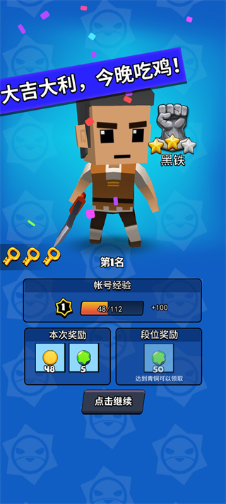 7. 获胜后将显示【大吉大利,今晚吃鸡】结算界面,可领取账号经验、金币等奖励,用于角色成长、武器强化等后续发展。