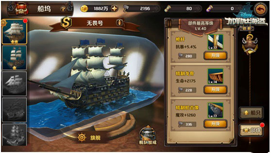 b) 部件升级:每艘船配备专属部件,提升部件等级并在设为旗舰后,可进一步增强特定属性。
