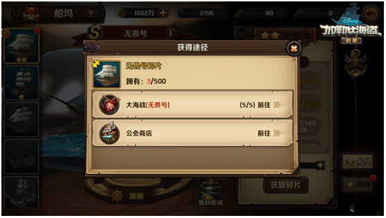 当船只碎片不足时,点击“获取碎片”按钮可进入大海战玩法收集所需材料。