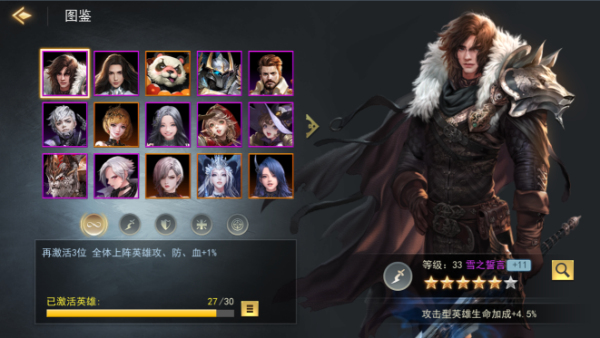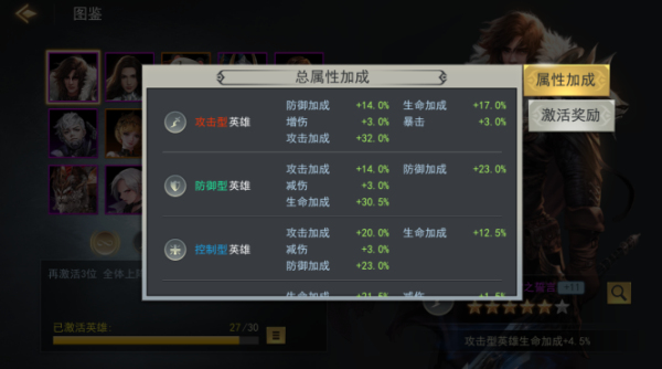 只要获取某位英雄(无需上阵),即可在图鉴中激活其对应属性加成。例如:激活“雪之誓言”后,上阵队伍中所有攻击型英雄生命值提升4.5%。此外,累计激活一定数量英雄后,还可解锁全体英雄的攻击、防御、生命百分比加成奖励。