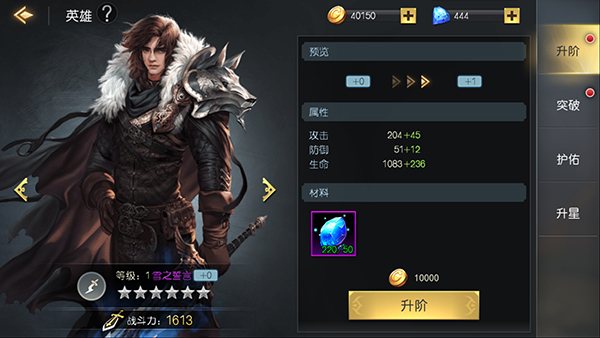 升阶需满足英雄等级要求,并消耗升阶石;从+4阶起,还需额外提供该英雄的碎片,且随阶数提高,材料需求量逐级递增。