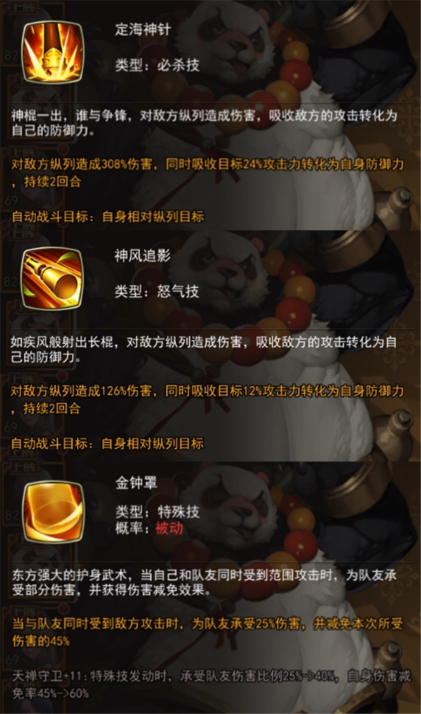 对敌方纵列造成308%伤害,并吸收目标24%的攻击力转化为自身防御力,效果持续2回合。