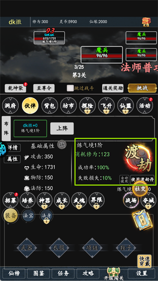 4. 渡劫突破体系,真实还原修仙进阶体验:修为达上限后需渡劫方可突破,成功率机制高度还原传统修真设定,步步惊心,步步登仙。