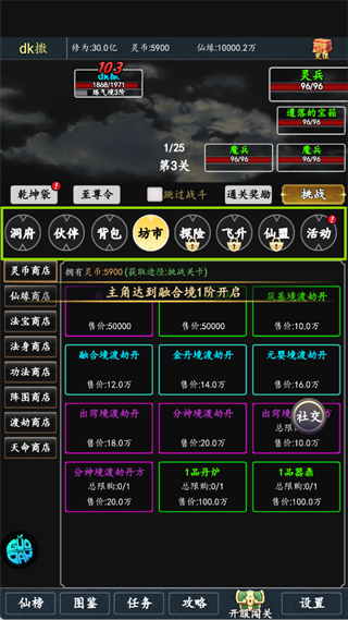 坊市提供灵币或仙缘兑换功能,可购买渡劫丹、丹炉等实用道具。不同商店对应不同资源类型,随着主角境界提升,将逐步解锁更多坊市功能与高级商品,有效加速养成节奏,助力高效修仙。