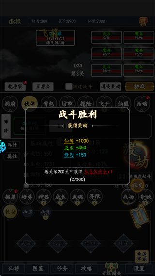 随着修为提升,需通过挑战关卡进一步强化实力。战斗胜利可获得仙缘、灵币与修为等奖励,关卡进度越高,收益越丰厚。特别提示:通关第200关将解锁强力红色伙伴,大幅提升战力,因此持续推进关卡是资源成长的核心手段之一。