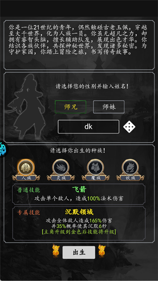 游戏开局提供多种族选项,默认为人族,同时开放灵族、魔族等其他种族。每种种族拥有独特的初始技能与成长倾向,直接影响前期战斗表现及后续培养路径,建议根据个人喜好与策略偏好慎重选择。