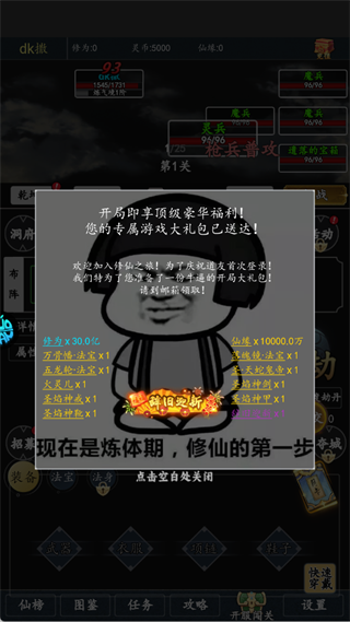 首次进入游戏将自动弹出开局福利窗口,内含30亿修为、多件强力法宝及伙伴等超值奖励。关闭窗口后,所有奖励均可在邮箱中一键领取,助你迅速建立优势,快人一步踏上仙途。
