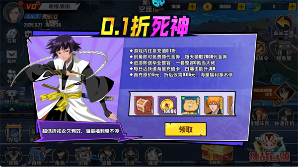 创角即享永久0.1折特权,免费领取代金券、毕业阵容及海量充值卡。首充6元仅需0.06元,上线即可获得黑崎一护等核心角色奖励,开局即巅峰。