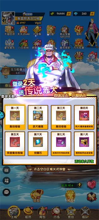 连续登录8天,即可免费领取传说级船员赤犬、集结卷轴及自选宝箱,是前期获取核心角色与关键资源的重要途径。