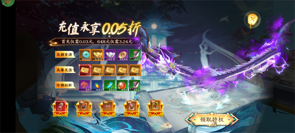 游戏内终身享有0.05折充值优惠,首充仅需0.03元,648元档位实际支付仅3.24元。以极低成本获取海量资源,迅速提升战力,抢占先机。