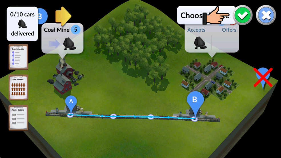 6. 设置列车路线:先选中煤矿站作为起点,再选择小镇站作为终点,最后点击确认按钮完成路径设定。