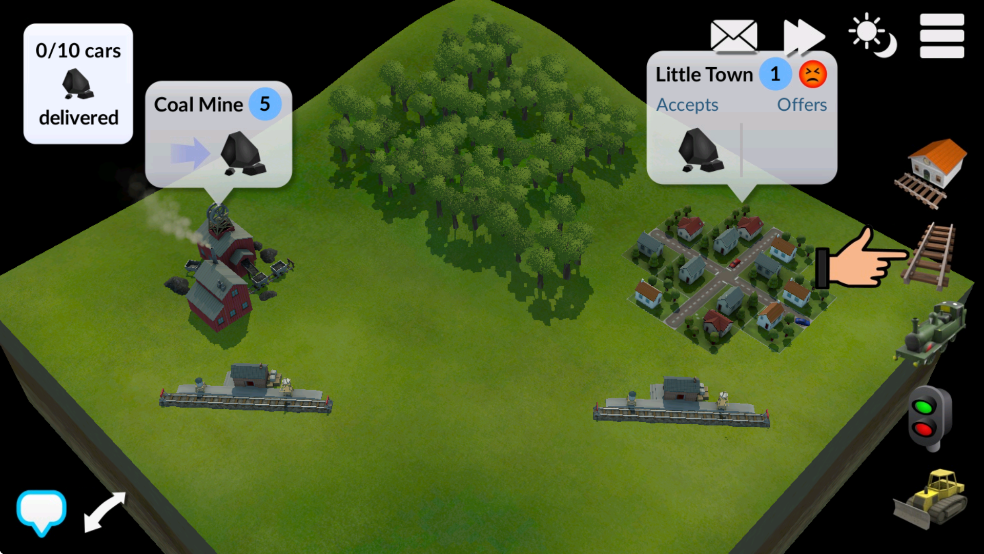 3. 进入关卡后,你的初始目标是修建一条连接煤矿站与小镇的铁路,并运送10节车厢的煤炭至目的地。