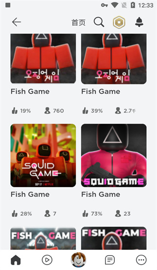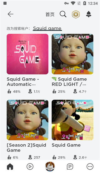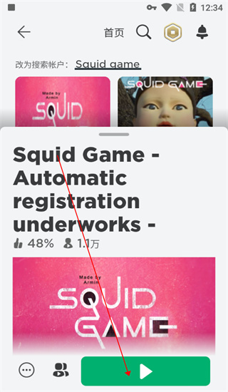 Squid game 进入方式:在首页右上角搜索“Squid game”,选择点赞率约48%、在线人数约1.1万的房间即可。