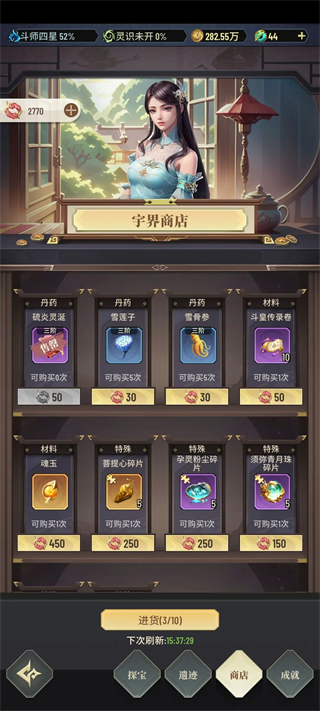 3、宇界商店中的秘药虽可买满,但建议延迟至斗者后期甚至斗师阶段再集中采购。因前期升级迅速且大境界突破期间商店不会刷新,过早购买性价比偏低。