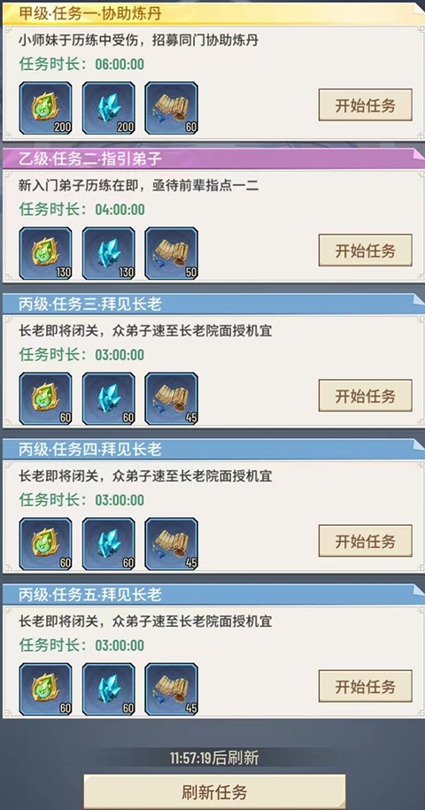 2、宗门任务:位于大殿右侧,提供多种时长与奖励等级的任务。不满意当前任务?可通过刷新机制获取更高收益选项。