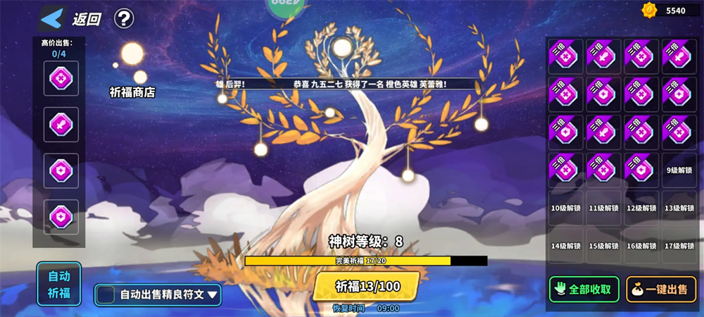 祈福所得符文可通过分解转化为神树币,用于在神树商店兑换关键资源,尤其是红色史诗符文。每日系统会指定四种符文可“高价出售”,这是获取神树币的最快途径。切记:不要开启“自动出售精良符文”功能!应手动保留所有高价符文,待其占满格子后再一键出售,此时可获得三倍收益。