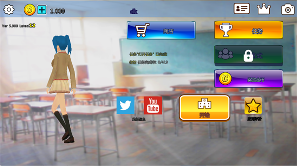 3. 主界面提供【商店】购买道具、【任务】查看目标,点击【开始】即可进入校园场景。