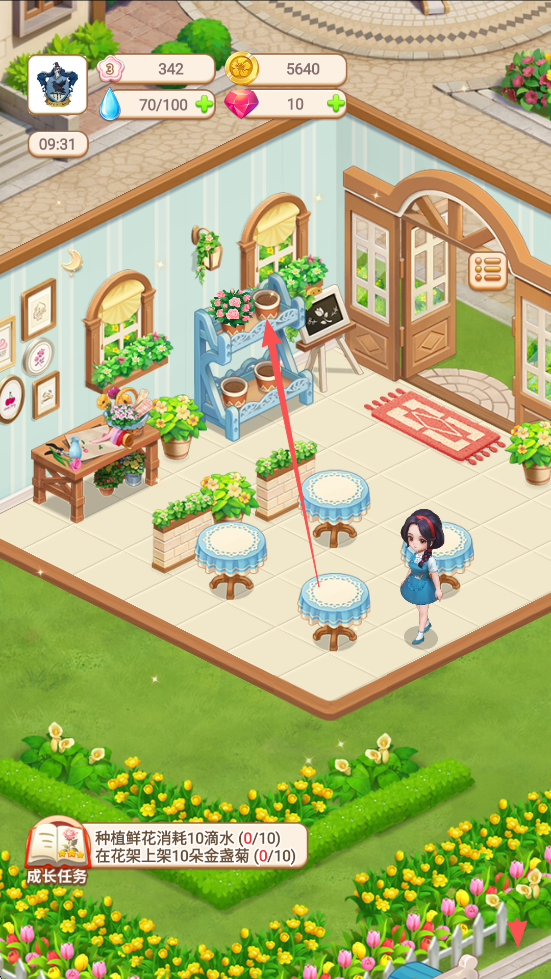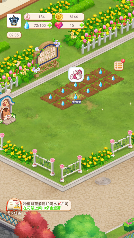 3、点击浇水按钮,促进鲜花生长