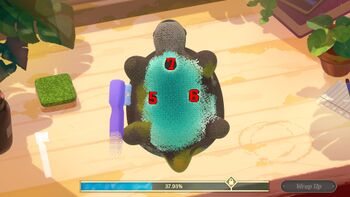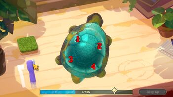 清洁对象为一只陶笛造型的乌龟摆件。先用海绵清理龟壳表面,再用牙刷处理孔洞周围。龟背有4孔,腹部有3孔,全部暴露后可触发音符互动。
