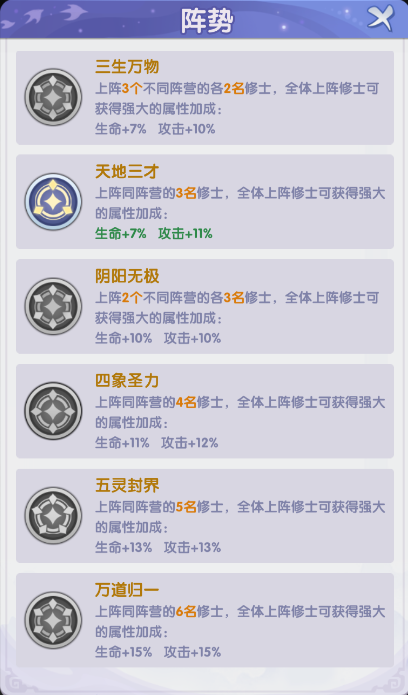 根据上阵修士数量及其所属阵营,可触发不同阵势加成,获得额外属性提升。建议在培养与上阵时优先参考阵势效果进行阵容搭配,最大化战力收益。