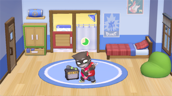 在汤姆猫的卧室中,让他拿起吉他即兴演奏,不仅能触发治愈系互动动画,还可提升角色好感度,解锁更多剧情与动作。