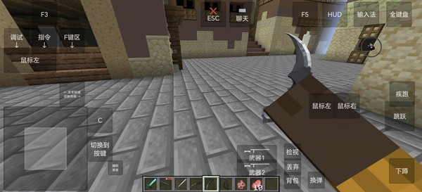 除各类枪械外,玩家还可使用近战武器;右侧虚拟按键支持疾跑、跳跃、下蹲等战术动作,显著提升战场机动性与生存能力。