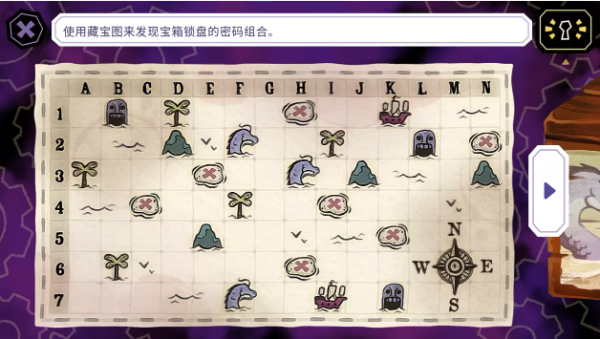 思路:想象自己站在藏宝图上方观察四周——左手最近是龙,右手第二近是山,中间为海鸥与椰树,因此应从H6格朝W方向观察(答案:H6W)。 - 空中花园谜题