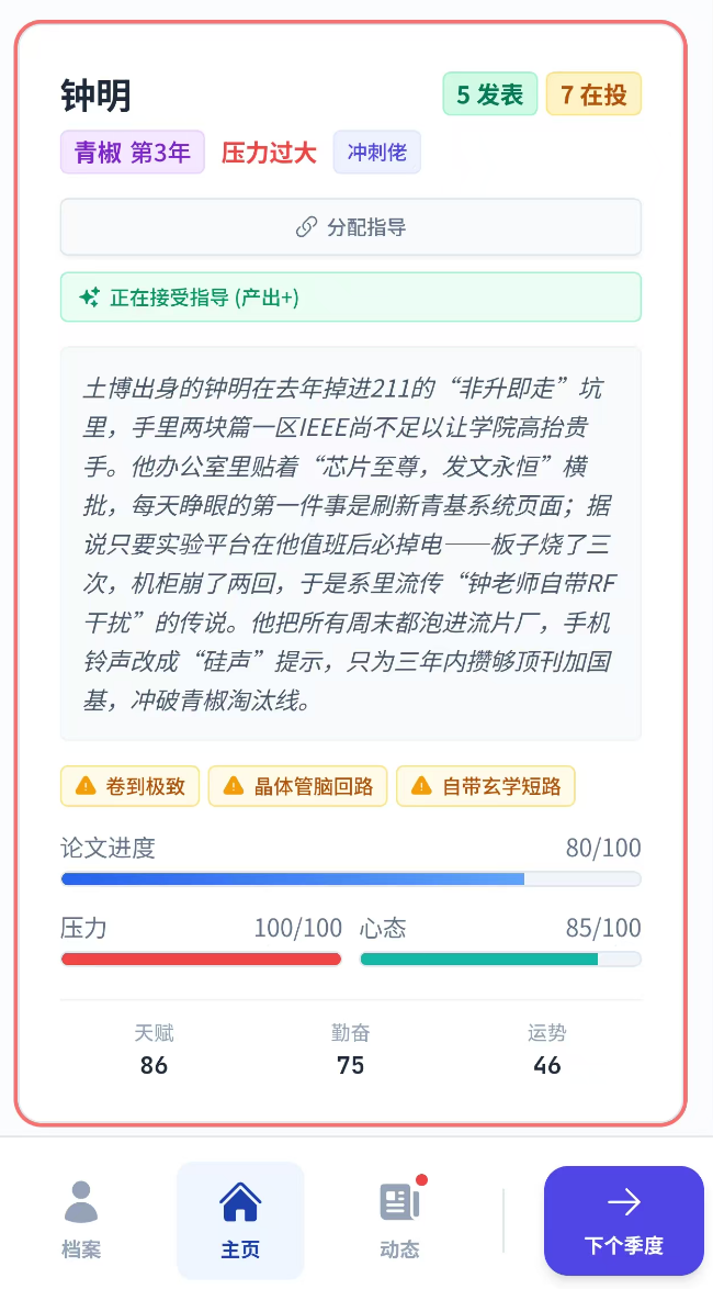 2. 多维指标策略平衡:玩家需同步管理心态、学术能力与经费三大核心资源,在紧张科研与必要休闲间寻找最优解。