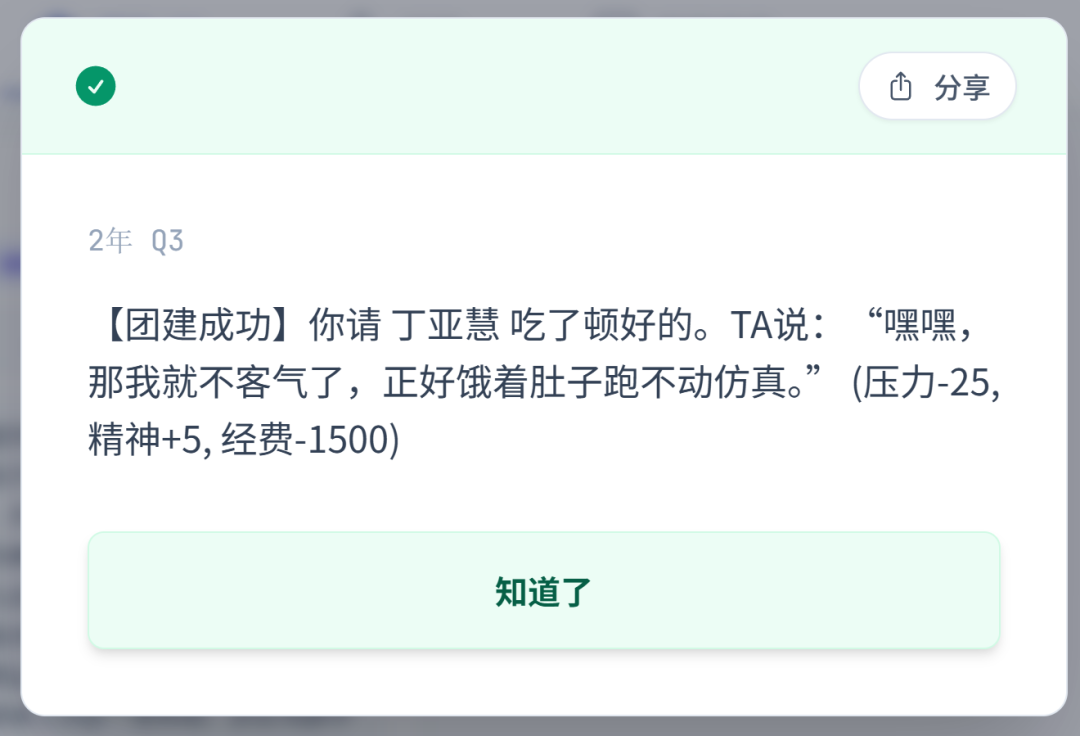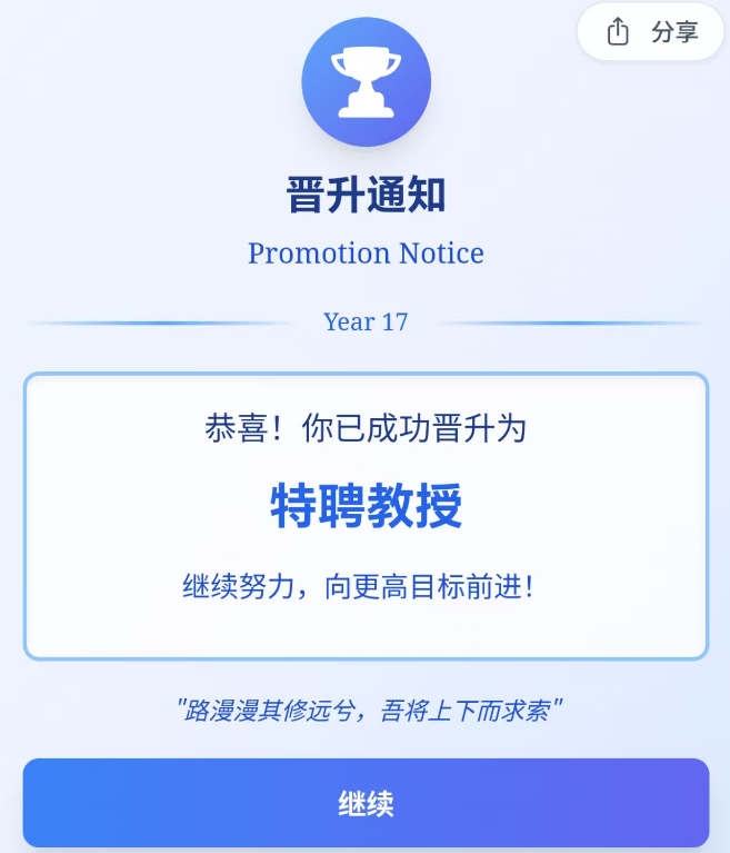 2. 学术能力提升极度依赖“散步”——每个季度务必安排三次散步,坚持到退休前,学术值轻松刷满100!